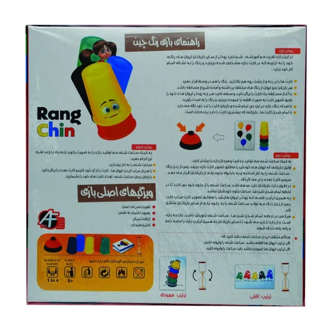 اسباب بازی رنگ چین یک بازی دسته جمعی می باشد که بسیار هیجان انگیز و مفرح می باشد. اسباب بازی رنگ چین هوش منطقی کودکان را افزایش داده و باعث بهبود مهارت هماهنگی بین چشم ها و دست ها در آنها می شود. اسباب بازی رنگ چین یک بازی گروهی و آموزشی است که به معرفی رنگ ها و اشکال هندسی می پردازد. این مجموعه ی نفیس شامل ۲۰ عدد لیوان کوچک رنگی، تعدادی کارت و یک عدد زنگ است. رنگ چین بعنوان یک سرگرمی باعث تقویت حافظه می شود. علاوه بر این بازی فکری رنگ چین سرعت عمل را افزایش می دهد.